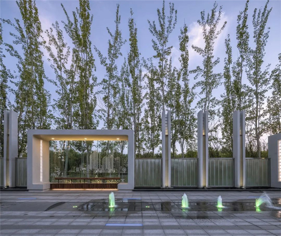 普通一街道,路边没有树。人行道变成了小广场,两排涌泉从路上汩汩涌出,有小孩在穿梭嬉戏。围墙,用U型玻璃建造,后面是高大的杨树,树影洒落在半透明的U玻上,形成斜斜的自然音符。五个清水混凝土的方框,破开了连续的围墙,通过其上的透明玻璃,把围墙后面的树木及水塘风景接纳透露进来;而方框中,有人闲坐,或端或歪,皆成了这框中之景……