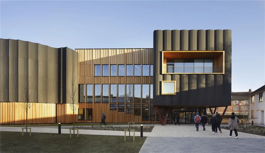 学生社区中心及协同工作环境则完美地实践了三个主要设计概念,这一区域包含了2000㎡的灵活教学空间,这一区域没有柱子,并有着大量的宽敞开放空间,这些开放空间可以被进一步改造为一个个蜂窝式分区。创意中心的核心是一个可以容纳200个座位的礼堂,这一空间可以举办学生的现场表演、社区活动及高规格会议。同时,礼堂外部由预制木材包裹,由此呼应了校园旁约克座堂高耸狭窄的壁龛造型。