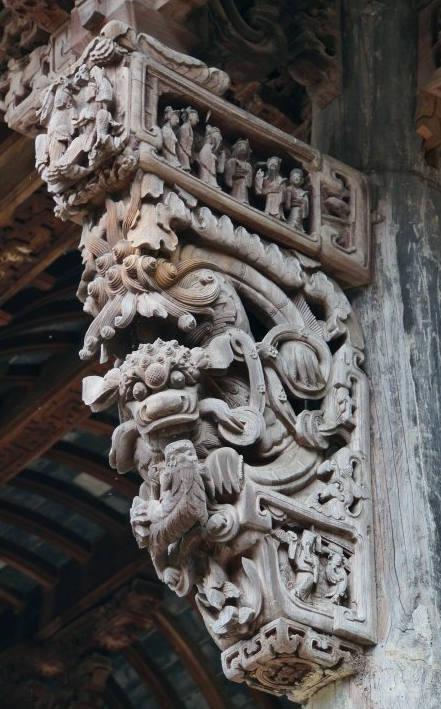 清代,“撑弓”逐渐演变成整块斜木雕刻,工艺日趋繁琐,雕工精美,刀法纯熟,雕刻内容更是丰富多彩。