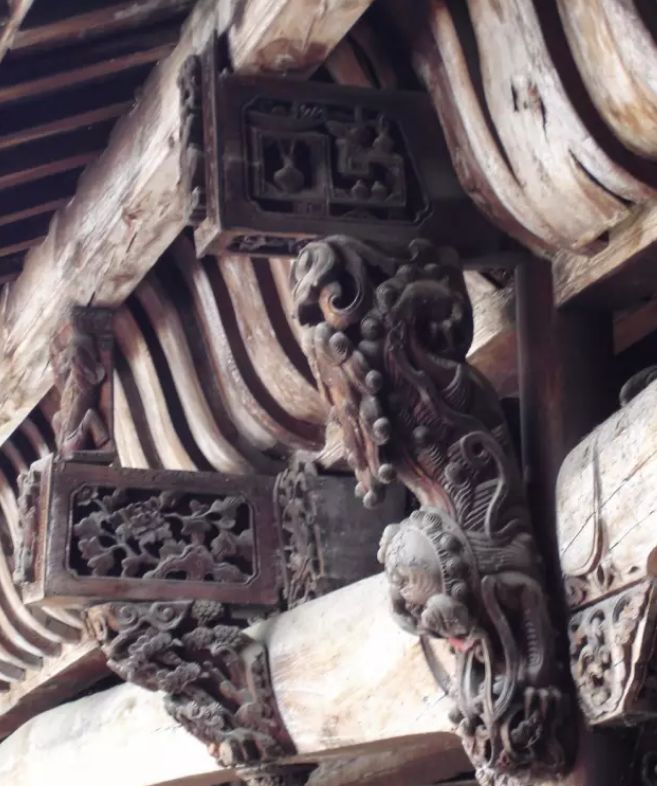 撑弓(撑拱、牛腿)作为古建筑中的构件之一,主要起支撑建筑外挑木、檐与檩之间承受力的作用。从明代开始,撑弓的雕饰作用大大盖过了其实用性,逐渐出现稍作雕刻的竹节、花鸟、松树之类的浅雕。