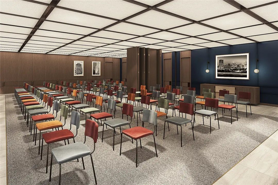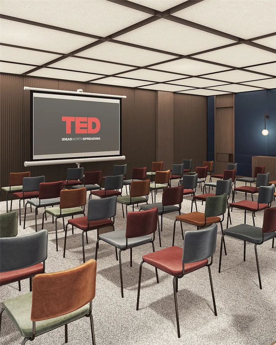 MAWD通过轻松明快的材料语言和霓虹灯标牌为健身房带来了活力。同时,健身房内部配置了具有最新的技术支持的健身设备,让租户能够发挥最佳运动表现。 先进的健康设施正成为吸引并留住优秀科技型企业的主要驱动因素之一。MAWD 处于这种方法的最前沿,设计休闲区域的设置既能反映其地理位置,也能迎合特定受众。 会议室 会议室场景布置充满古典主义风格,款式老旧的皮质靠背座椅,背景墙上的深棕色木制格栅,天花上的四方格,呼应着上世纪中叶的时代特性。