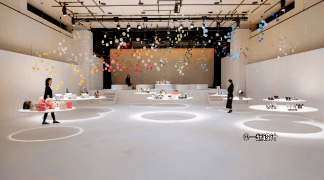 展示的鞋子和包包安静的摆放在悬浮的白色圆桌上,与上方跳跃的多彩景象形成美妙的对比,