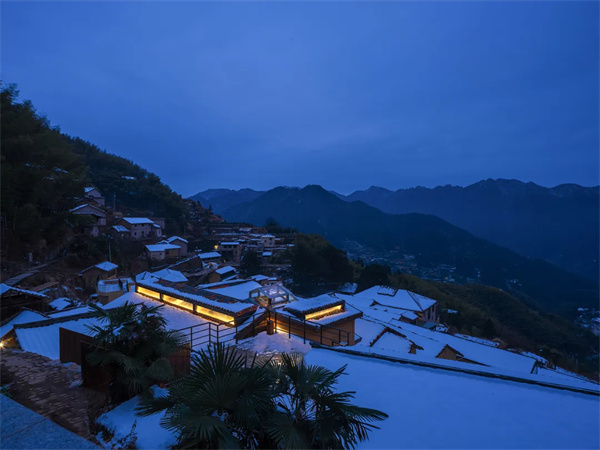 十钟山房隐于郁郁苍苍的半山腰,夜晚俯瞰,通体透亮。