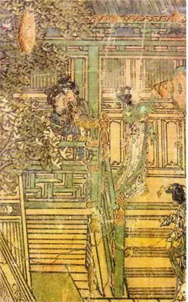 本时期的台基已较为成熟,如中唐时期的输林窟第25窟壁画所绘,台基多为矩形,装饰十分华丽,上部四沿与侧面均镶嵌了不同颜色的团花纹方砖,台阶部分亦为花砖包砌。建筑前都的莲池边则有栏杆围绕,主体为木制,纤细轻巧,望柱顶端和构件交接处为金属装饰,类似做法仍可见于日本传统建筑中。栏板上还雕饰有各种棂花纹样。