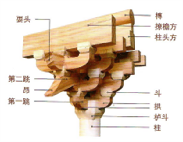 斗拱主要由水平放置的方形斗、矩形的拱以及斜置的昂组成,通过榫卯结构相互连接,用以承托上方的博、枋等构件。斗拱至唐宋时期形成了较为固定的构成模式,并一直延续至明清。其规格以拱与昂的出跳数量来定义,通常为一至五跳,宋代分别称为四铺作至八铺作,清代则取奇数,称为三踩至十一踩。图示即为一朵宋代五铺作斗拱模型。