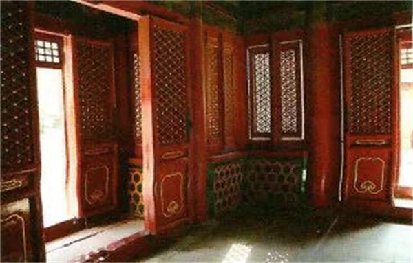 隔扇门窗多用于小型建筑,常见为两扇对开,但亦可根据需要使用多对隔扇。隔扇门由上部的棂花和下部的裙板组成,隔扇窗则整扇以棂花镶嵌。门窗棂花的样式繁多,简易者可用直棂,复杂者宛如花团锦簇,如平阳金墓中的仿木砖雕隔扇就极其繁复华丽。明清时期的高等级棂花多用毬纹。图示为北京故官内的隔扇门窗,均为此种做法。