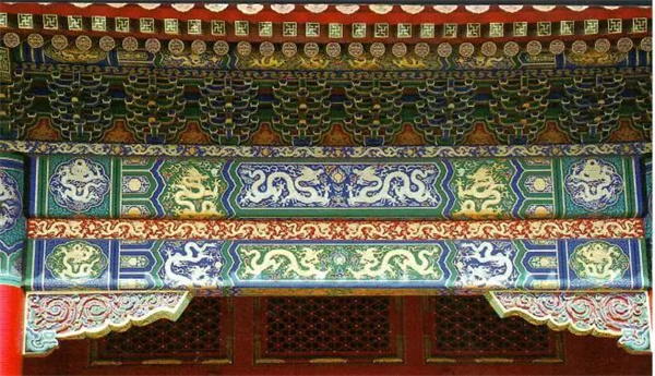和玺彩画出现于清初,是在明代旋子彩画的基础上衍生而来的新型彩画,是清代官式彩画最高等级的样式,仅用于最重要的宫殿之上。和玺彩画中大量使用了象征皇权的龙风纹样,构图严谨,色彩绚丽,同时还普通使用沥粉贴金工艺,十分富丽堂皇,图为故宫太和殿的龙纹和玺彩画,采用了特殊的两色金工艺,通过使用不同含量的金箔,使色彩更加丰富绚丽。