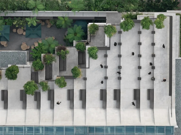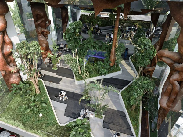 街头由于气候环境及当地建筑政策,印尼的建筑经常有飘逸的屋顶和开放的空间。实现这种建筑退台公园是最常用的一个,通过控制每层控制每层结构外挑的距离实现,已经成为了印尼建筑届的经典玩法。除此之外,印尼绿洲花园还会包含墙顶一体、多层绿化平台、大量自然元素、开放式性互动商业空间以及被动式低耗能等特点。