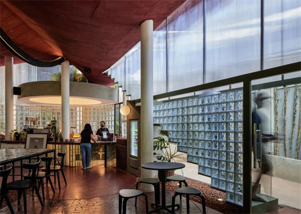 咖啡厅室内外的概念由一系列漂浮混凝土的阴影融合在一起,每小时营造出不同的氛围,通过无缝延伸接触现有树冠的屋顶天花板元素实现,为游客带来独特的体验,让他们在顶棚下的热带风情中翩翩起舞。开放式布局创造了高效的室内空间流动以及酒吧区、公共餐桌和流线的互动。