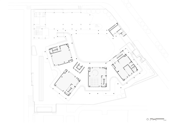 为老旧小区儿童设计的 "内向外 "游戏板。这是一个幼儿园改扩建项目,位于上世纪 80年代深圳建成的第一个住宅小区内。基地北侧是一栋保留下来的老建筑,南侧是一栋轮廓很不规则的建筑,距离住宅区很近。设计师没有采用传统的矩阵式布局,而是通过在不同方向上组织一系列轴线,在新建筑和基地之间建立了一种新的几何关系。这是教室避开居民和主干道影响的最有效方式。教学楼之间的空隙为整个校园提供了顺畅的流线。新楼和旧楼围合出一个椭圆形的大庭院,用于举办各种集体活动。