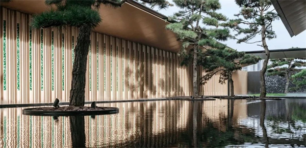 中庭的设计构思来源于对古代山水画的解读。游廊设计转译了宋式美学,突出线条的水平感,并向中庭内侧延伸,呈现出一种轻盈典雅的特征。与现代的材料和结构相融合,经过推敲后的曲线更加轻盈,让整个建筑舒展大气,形成了更富当代性的摩登形象。