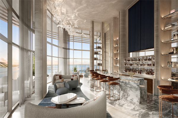 空中酒吧和休息室是迈阿密瑞吉公寓的点睛之笔。双层高的天花板、全景视野和温馨的阳台让住户可以一边放松身心,一边欣赏阳光斑驳的比斯坎湾。
