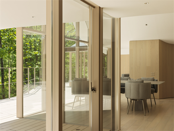 建筑外墙大面积采用玻璃和浅色木材,让室内外自然融合,同时增强采光和通透感。