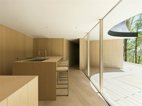 弧形白色天花板设计,使空间更显柔和与轻盈,同时增强自然光的漫反射效果。低矮的家具使视线不受阻碍,延续空间的通透感,并在视觉上与室外森林景观融合。
