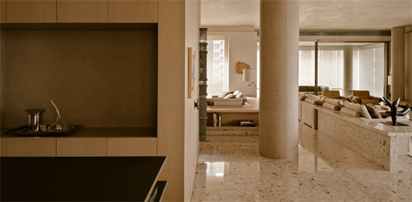 公寓的起居空间整体采用低饱和度的色调,营造出宁静且富有质感的氛围。同色系的家具使空间更加和谐统一,而沙发的水磨石一体底座则增强了空间的稳重感,与整体设计语言相呼应。