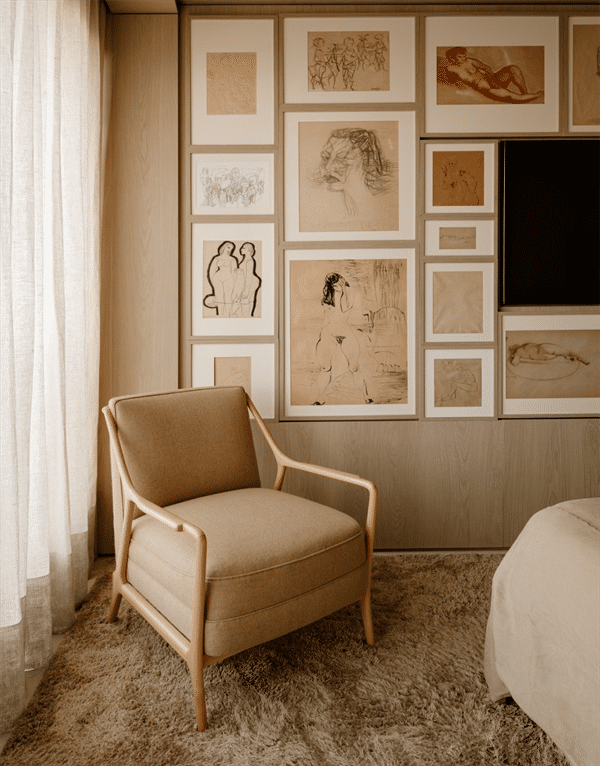 通往卧室的过道,其墙面进行了凹陷设计,打造出一处艺术展示区,犹如一个私人画廊。