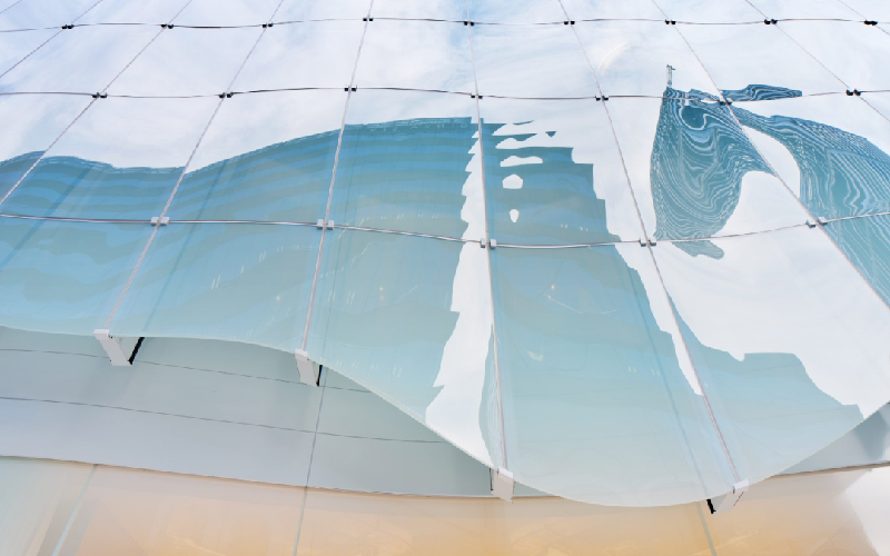 玻璃带有柔和的蓝色调,在阳光下泛起微光,仿佛一层轻盈的薄纱笼罩在建筑表面。